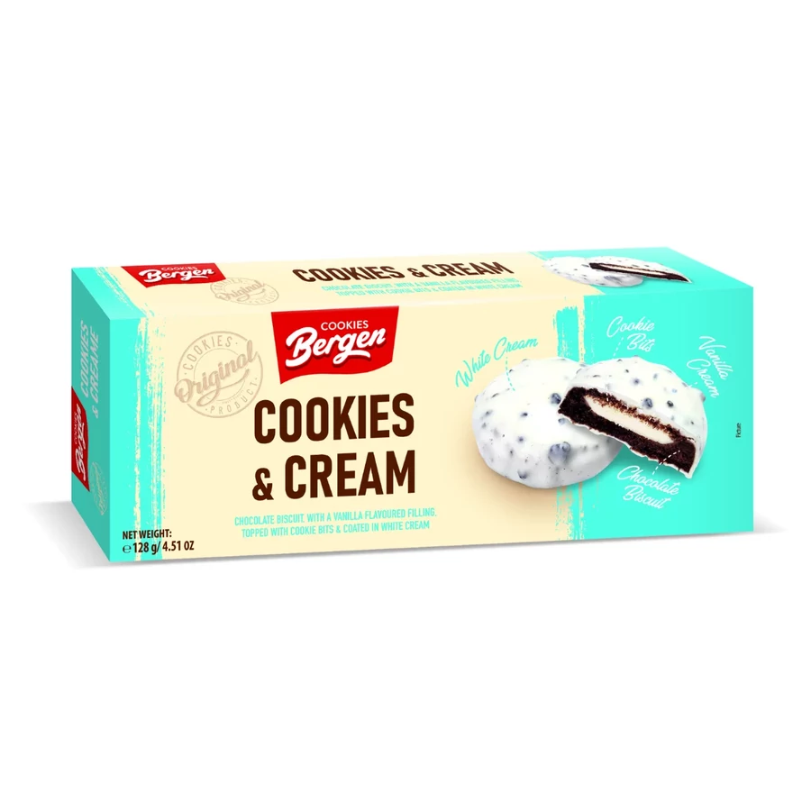 A Bergen Cookies & Cream egy élvezetes kényeztető sütemény, amelyben a rostélyos, ropogós kakaós keksz találkozik a selymes tejkrémmel, mindezt fehér mázas bevonat zárja körül, és elhelyezésre kerülnek benne finom kekszdarabkák. A recept harmonikus kontrasztot teremt a kakaó intenzív aromája és a tejkrém lágy édessége között.