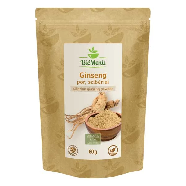A BioMenü BIO GINSENG por szibériai 60 g egy prémium minőségű, természetes táplálék-kiegészítő, amely segít a stressz és fáradtság leküzdésében. Olyan aktív emberek számára készült, akik szeretnék maximálisan kihasználni a mindennapi élet kihívásait. Ez a gyógynövény különösen ajánlott lelki és fizikai kimerültség esetén, mivel hatékonyan támogatja a vitalitást és az energiaszintet. A termék bio minősítése garantálja a tisztaságot és a minőséget, hiszen csak természetes, vegán összetevőkből áll. Mentes mindenféle mesterséges ízesítőtől, színezéktől és tartósítószertől, így a legjobb választás a tudatos táplálkozást követők számára. BSE/TSE, GMO- és besugárzásmentes, továbbá hozzáadott cukor nélkül készült, alacsony zsírtartalmú és gazdag élelmi rostokban. Ajánlott napi adagja 2-3 g, így könnyen beilleszthető a napi rutinba. Az egyetlen összetevője a 100% bio szibériai ginseng (eleutherococcus senticosus) por, amelyínából származik és a legmagasabb minőségi követelményeknek felel meg. Tegye energikusabbá napjait a BioMenü BIO GINSENG por használatával, és tapasztalja meg a természet jótékony hatásait!