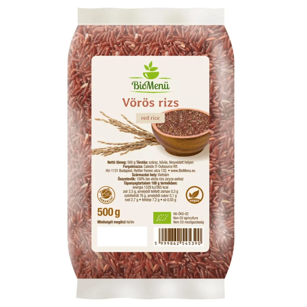 A BioMenü BIO VÖRÖS RIZS500 g egy ínycsiklandó és tápláló választás, amely tökéletesen megfelel a tudatos táplálkozás igényeinek. Ez a 100%-ban bio vörös rizs gluténmentes, vegán és GMO-mentes, így ideális mindenki számára, aki odafigyel az egészséges étrend kialakítására. A termék a legszigorúbb egészségügyi elvárásoknak is megfelel, hiszen mentes a mesterséges ízesítőktől, színezékektől és tartósítószerektől. Vietnám gyümölcsös vidékein termesztett vörös rizs gazdag tápanyagokban, amely hozzájárul az egészséges és kiegyensúlyozott táplálkozáshoz. Felhasználásának sokfélesége lehetővé teszi, hogy köretként, salátákban vagy különböző ételekhez egyaránt elkészítse. Élvezze a természetes ízek harmóniáját és a bio minőséget minden falatban! **Összetétel:** 100% bio vörös rizs (Oryza sativa) **Származási hely:** Vietnám