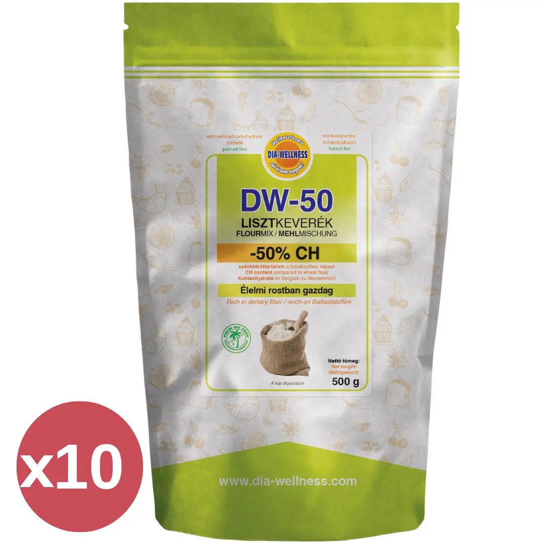 A DW-50 lisztkeverék kiegyensúlyozott receptúrával készül, amely a csökkentett szénhidráttartalmat magasabb rosttartalommal egészíti ki. A cél nem a radikális megvonás, hanem az, hogy a mindennapi sütés-főzés továbbra is élvezetes és kiszámítható maradjon a tudatos étrend mellett.