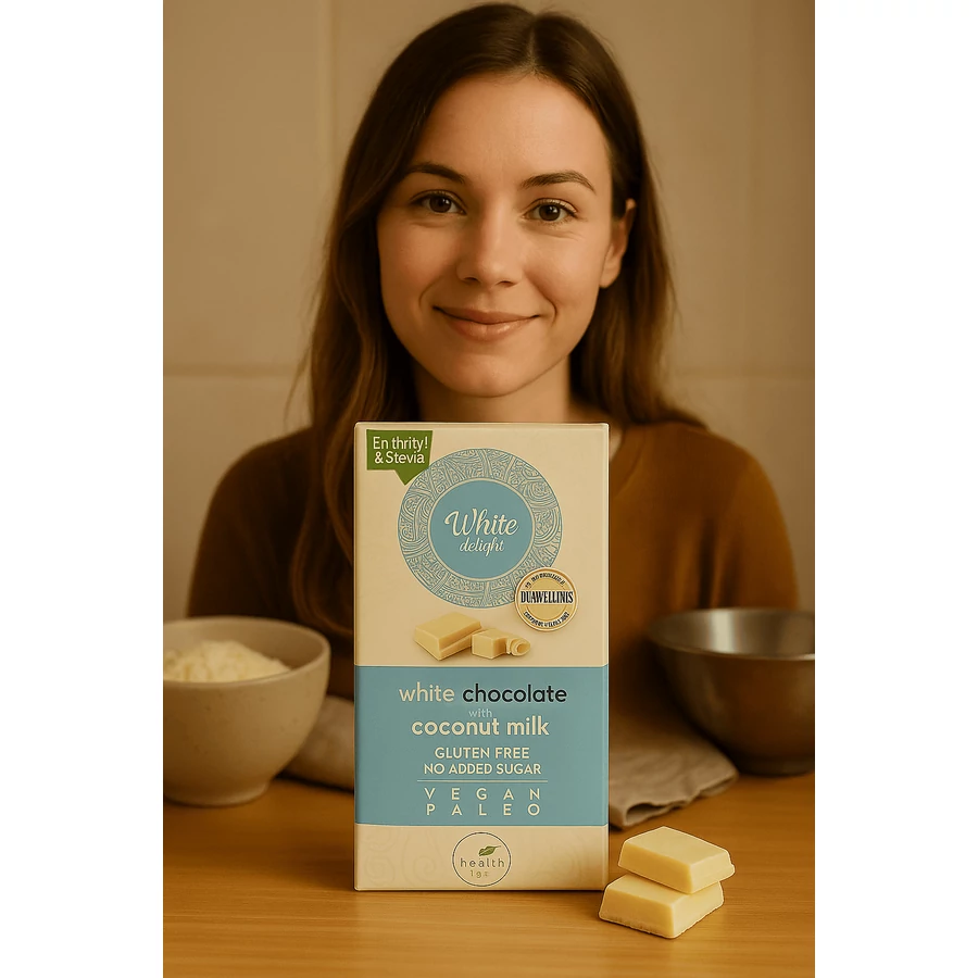 Kakaóvaj (35%), kókusztejpor (25%): (kókusz kivonat, hidrolizált keményítő, alfa-ciklodextrin), édesítőszerek: (eritrit (18%), szteviol-glikozidok (0,01%)), tápióka keményítő, élelmi rostok: (inulin, polidextróz), emulgeálószer: napraforgó lecitin, aroma