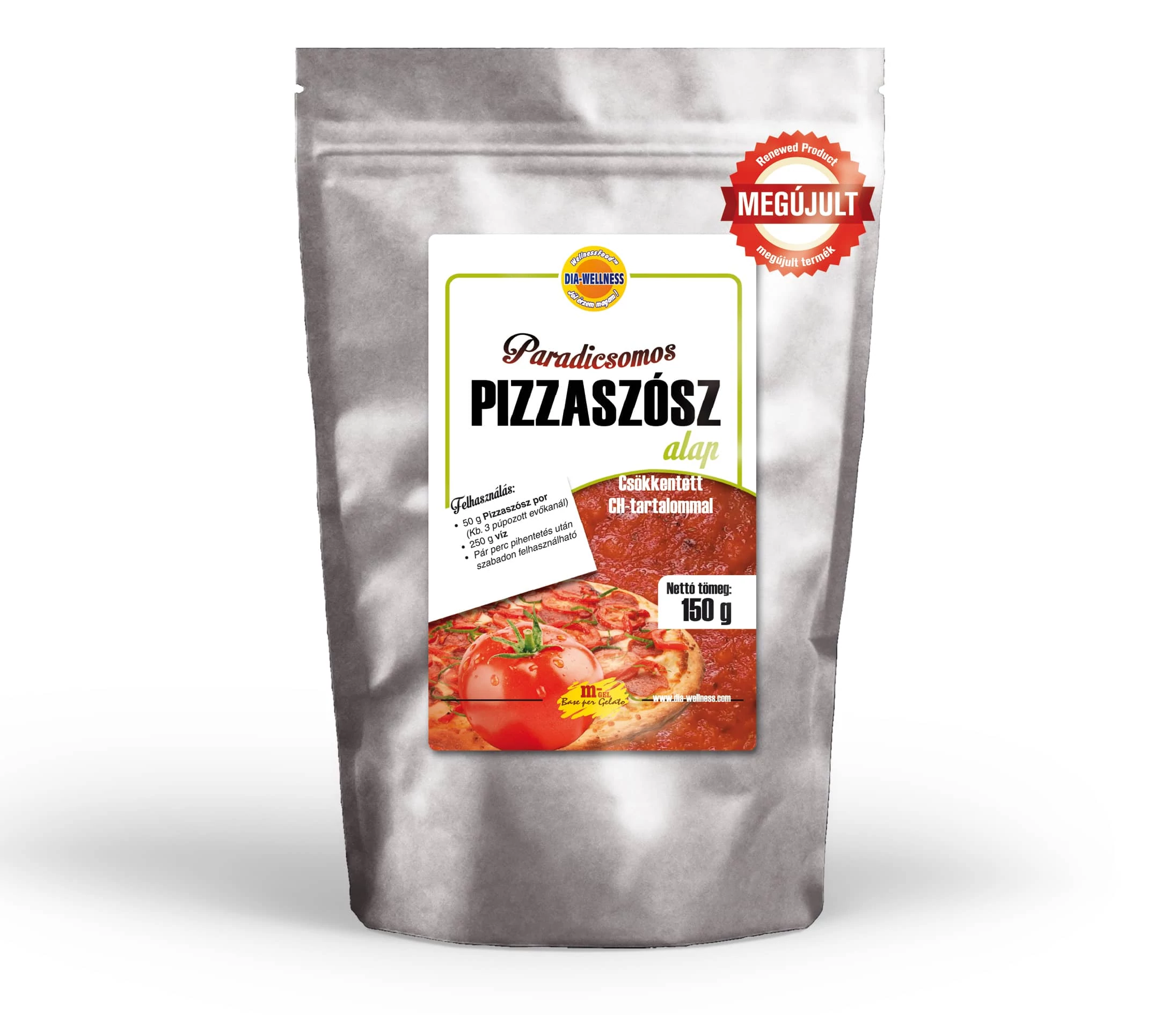 Felhasználási javaslat: 50 g (kb. 3 púpozott evőkanál) Dia-wellness paradicsomos pizzaszósz alapot 250ml vízzel összekeverünk,néhány perc pihentetés után felhasználható.
