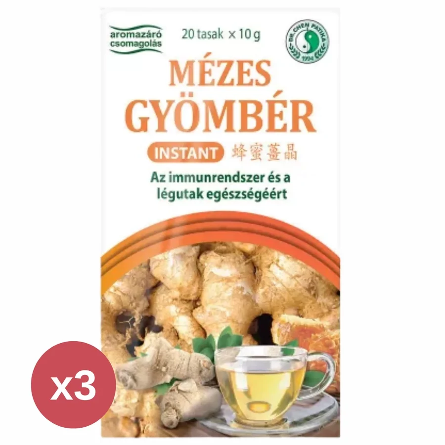 A Dr. Chen Instant gyömbér mézes tea a gyömbér erőteljes, frissítő ízét ötvözi a méz természetes édességével. A gyömbér tradicionálisan ismert immunerősítő, antioxidáns és a légutakat támogató hatásáról, míg az inulin, mint vízben oldódó rost, hozzájárul az emésztés egyensúlyához. A granulátum formának köszönhetően gyorsan elkészíthető forró ital, amely a hűvösebb napokon különösen jól esik, és segíti a szervezet védekező rendszerét.