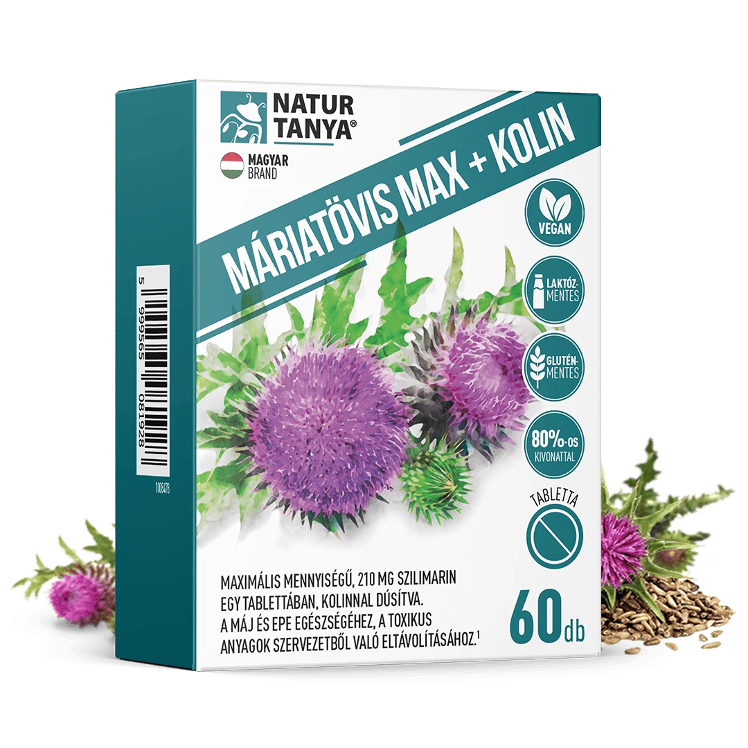 A NATUR TANYA® MÁRIATÖVIS MAX + KOLIN MAGAS KONCENTRÁCIÓJÚ, 80%-OS STANDARDIZÁLT SZILIMARIN TARTALMÚ MÁRIATÖVISMAG KIVONATOT TARTALMAZ, MAXIMÁLIS MENNYISÉGŰ SZILIMARIN TARTALOMMAL A NAPI ADAGBAN.