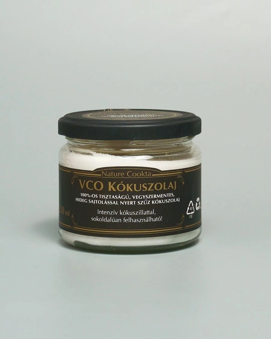 A Nature Cookta VCO Kókuszolaj az első sajtolásból nyert szűz zsiradék. Nagyszerűen használható süteményekhez, muffinokhoz, kelt tésztákhoz egyaránt. A vegyszermentesen készített alapanyag szilárd állapotában fehér színű, folyékony állapotában pedig áttetsző. A magyarországi gyártású termék enyhén kókuszos, édes íze miatt előszeretettel fogyasztják az édesség utáni vágy csökkentésére is. Rendkívül gazdaságos, hiszen szűrés után, akár többször felhasználható ételeinkhez.