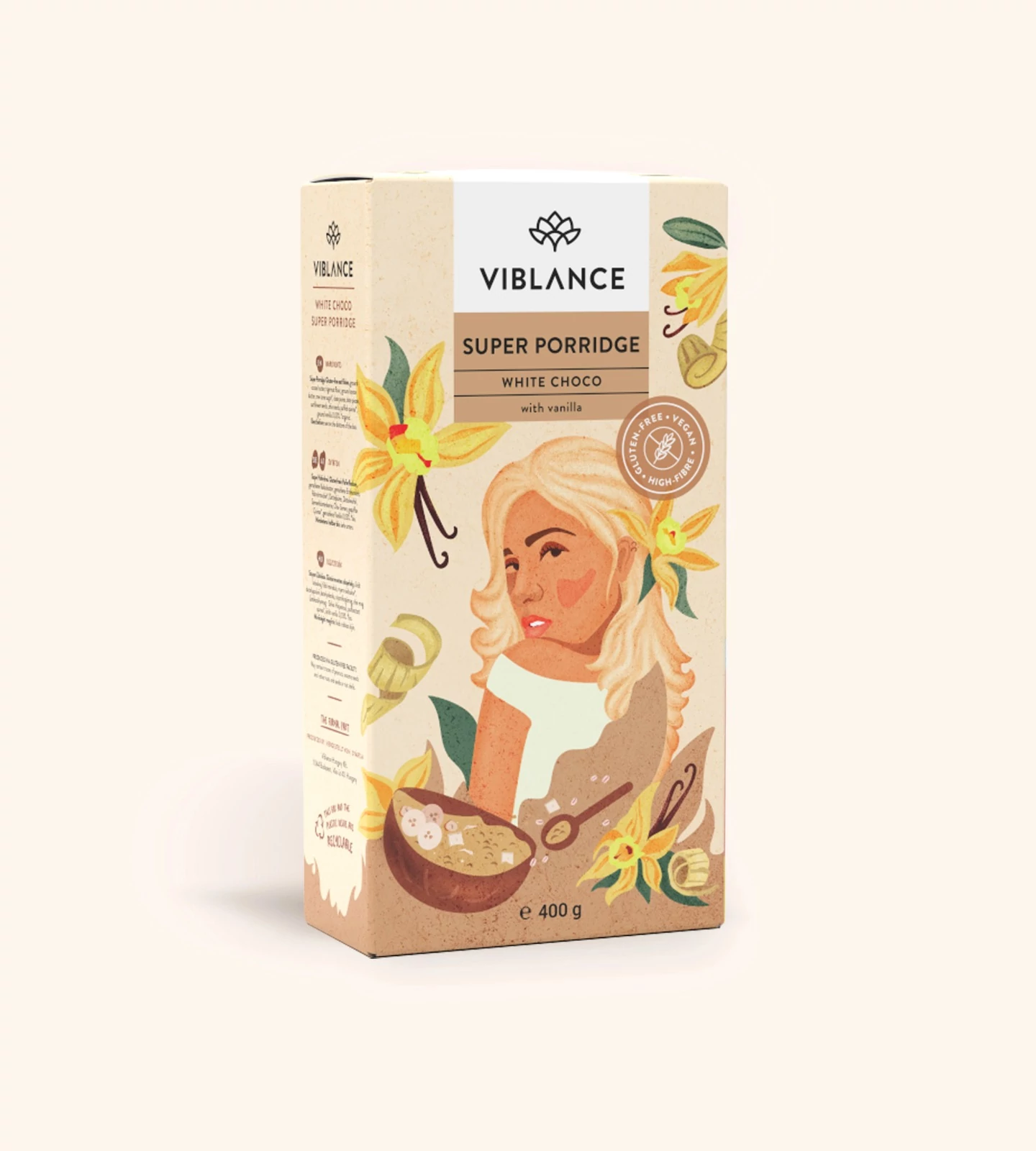"Mi lenne ha azt mondanánk: egy tál krémes fehércsoki ízű zabkása lehetne a holnapi reggelid? És ahhoz mit szólnál, ha a fehércsokoládé ízélményét tej nélkül is élvezhetnéd? Igazán finom vegán fehércsokit nehéz találni, megcsinálni pedig még annál is nehezebb. Ezért úgy döntöttünk tovább gondoljuk az eredeti fehércsoki fogalmát, és megpróbáljuk az összetevőit egy kásába pakolni, ami aztán meleg vízzel vagy növényi itallal felöntve a krémes fehércsokoládé ízélményét adja. Hogy még izgalmasabb legyen, adtunk hozzá egy csipet madagaszkári vaníliát, földi mandulát és tápláló superfoodokat, az édességéért pedig egy különleges nádcukor és a datolya felel. És bár ez a zabkása nem a hivatalos fehércsokival készül, büszkén üdvözüljük a többi Viblance Szuperkásánk között, mert brutál finom lett…"